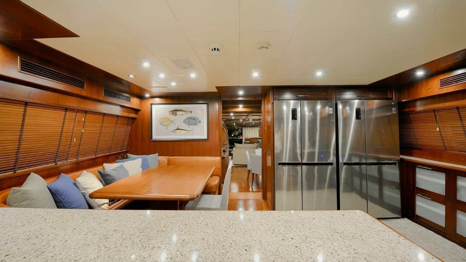 Forward on the main deck is a dine in galley with banquette seating, perfect for families.