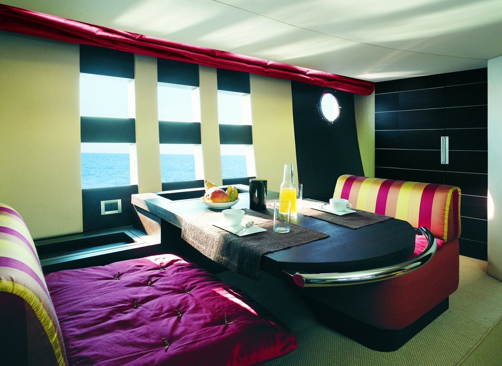 The main deck has a large open-plan salon with a glass wall that slides away to open on to the dining area. The bow features a sun lounging pad and private living area. There is a private water deck at the stern, where guests can also relax comfortably.