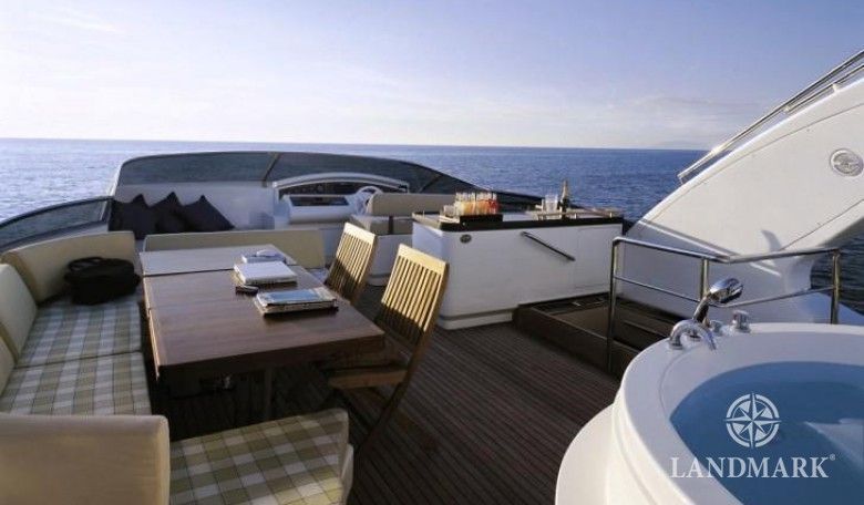 The main deck has a large open-plan salon with a glass wall that slides away to open on to the dining area. The bow features a sun lounging pad and private living area. There is a private water deck at the stern, where guests can also relax comfortably.