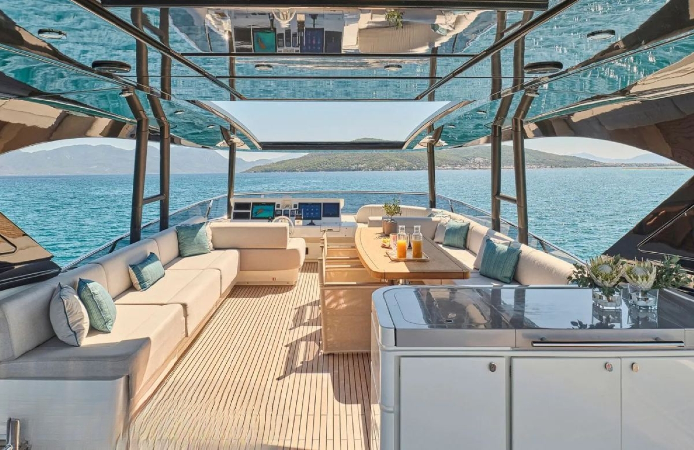 The flybridge offers 41.5sqm of outdoor living space sheltered under the retractable hard roof.
