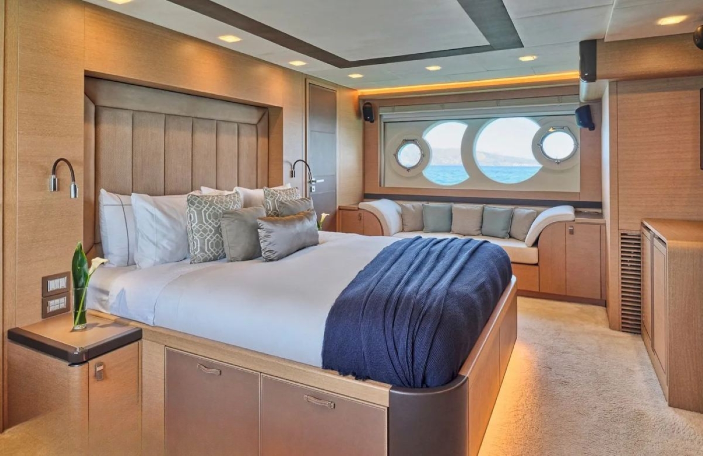 Four guest suites can accommodate up to nine guests and include a full beam master, double suite and two convertible twin/double – one including an additional pullman bunk.