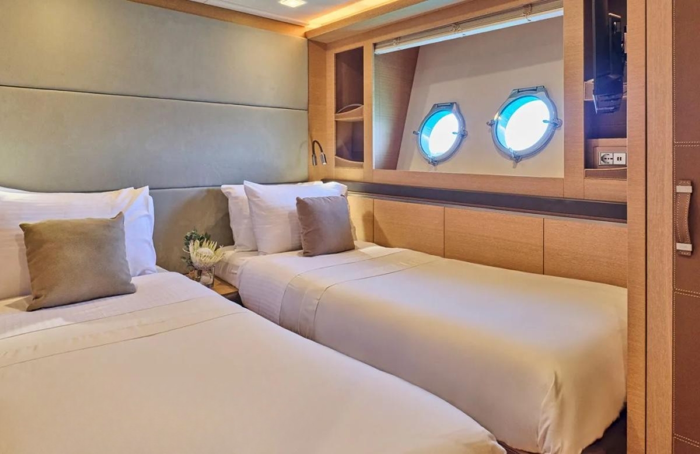 The bow lounge area features two innovative and adjustable semicircular seating areas with flexible tables which can transform into a delightful dining setting or sunbathing area.