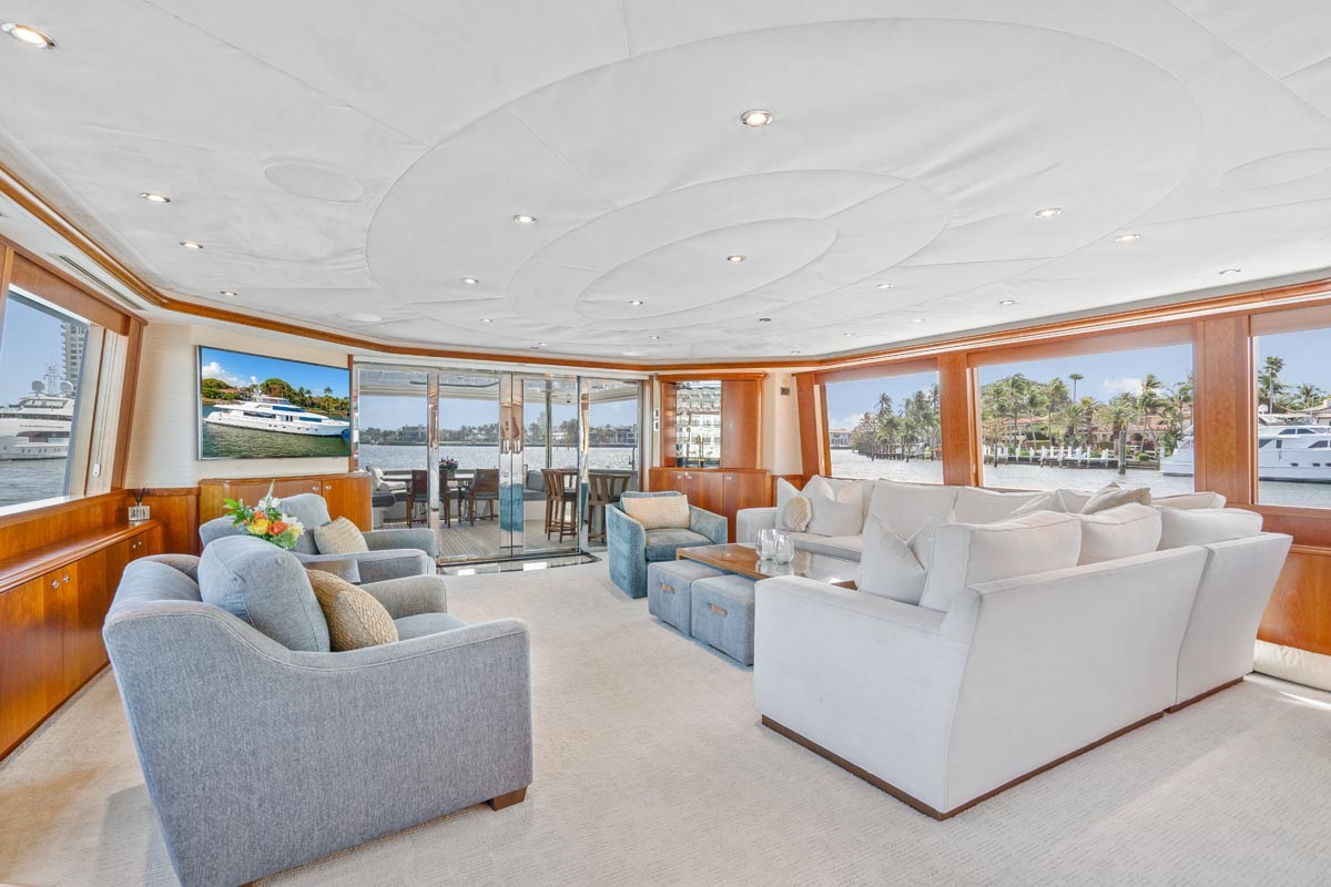 The elegantly furnished main deck salon is warm and inviting and benefits from ample glazing bathing the space in natural light.