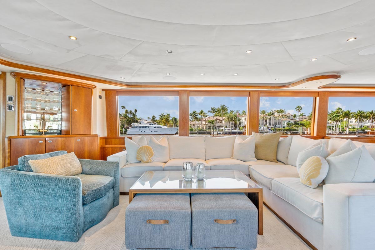 The elegantly furnished main deck salon is warm and inviting and benefits from ample glazing bathing the space in natural light.