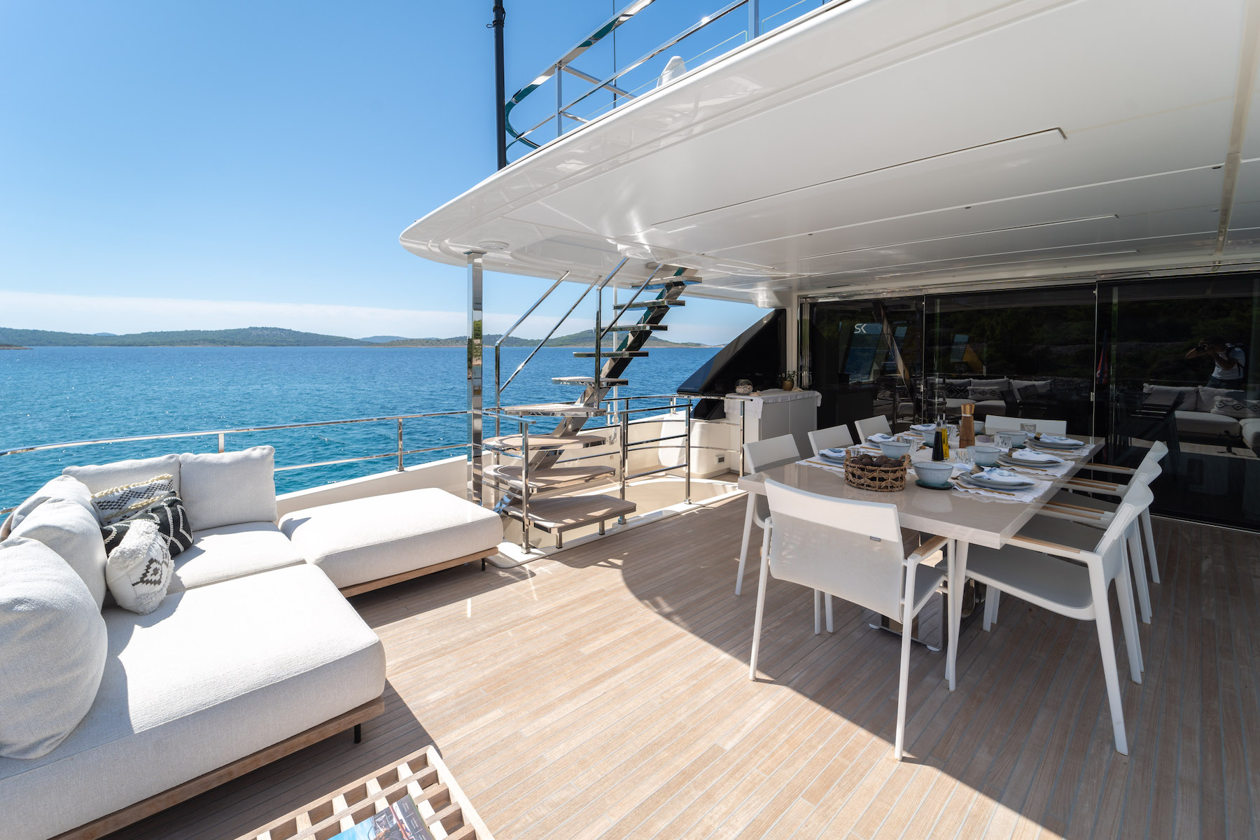 The main salon is a generous space including an aft lounge space and forward dining area. Large panoramic windows and a fold out balcony connect the space with the outside so guests can make the most of their surroundings.