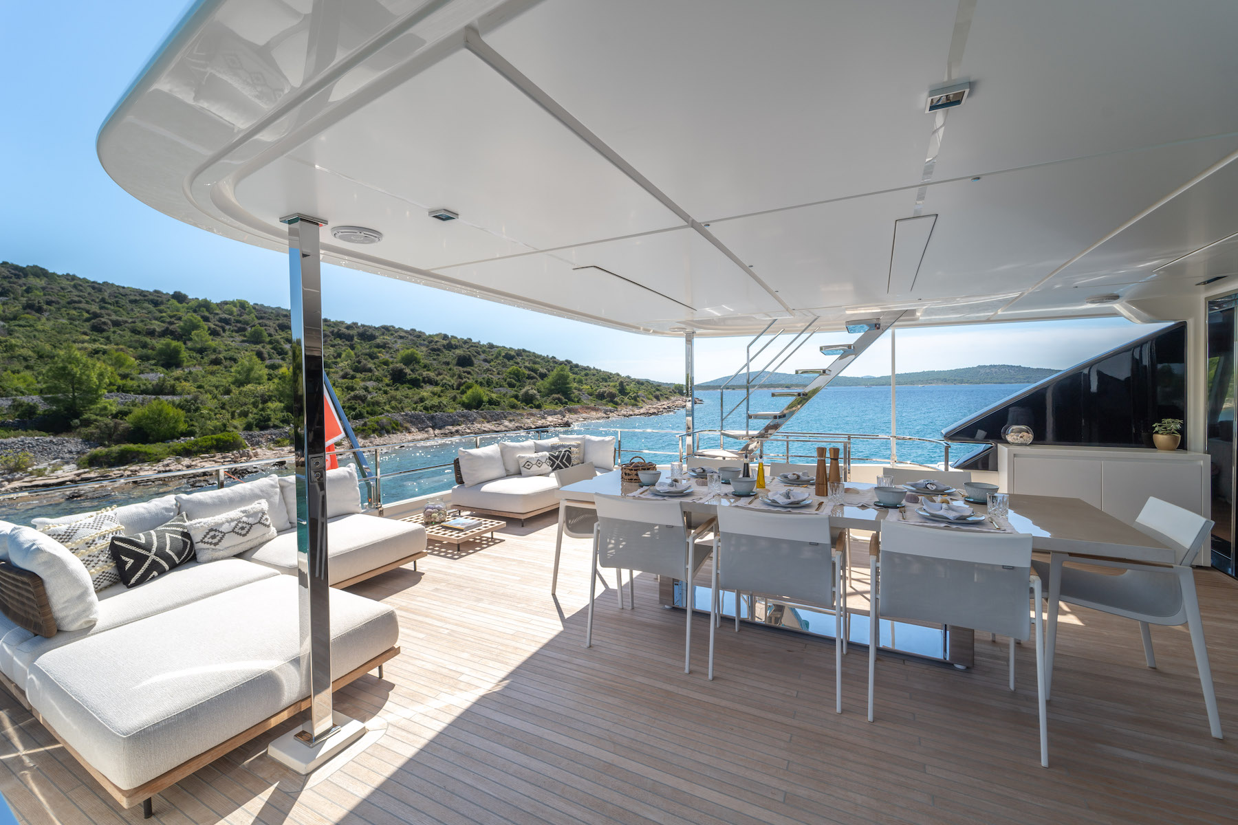 NOTABLE FEATURES OF SK: ~Tri-deck design ~Sun deck jacuzzi ~Open air cinema ~Stylish design in side and out ~Main deck master suite ~At anchor and underway stabilisers ~WiFi