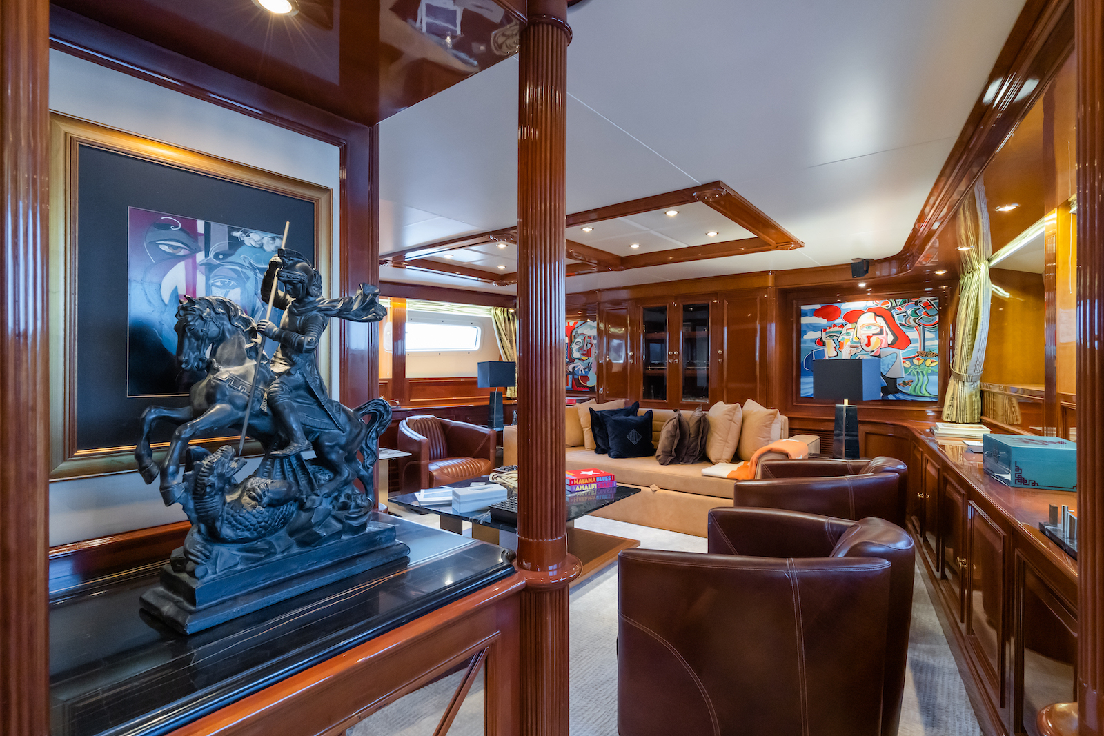 The main salon is configured with a lounge aft and dining setting forward. The lounge offers a selection of sofas and armchairs surrounding a coffee table, while the dining room can be set up for fine dining. Separating the two spaces is a sit up bar and elegant staircase to the lower deck.