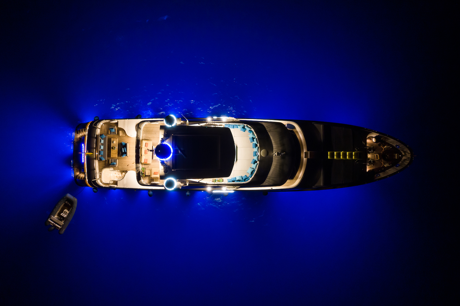 The upper deck aft is perfect for al fresco dinners with a lounge for unwinding with a drink and a convivial round table setting. Another dining setting is on offer on the main deck aft, from where guests can also access the swim platform.