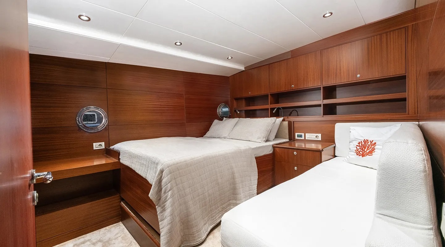 Up to twelve guests can be accommodated in five suites with additional accommodation for up to five crew.