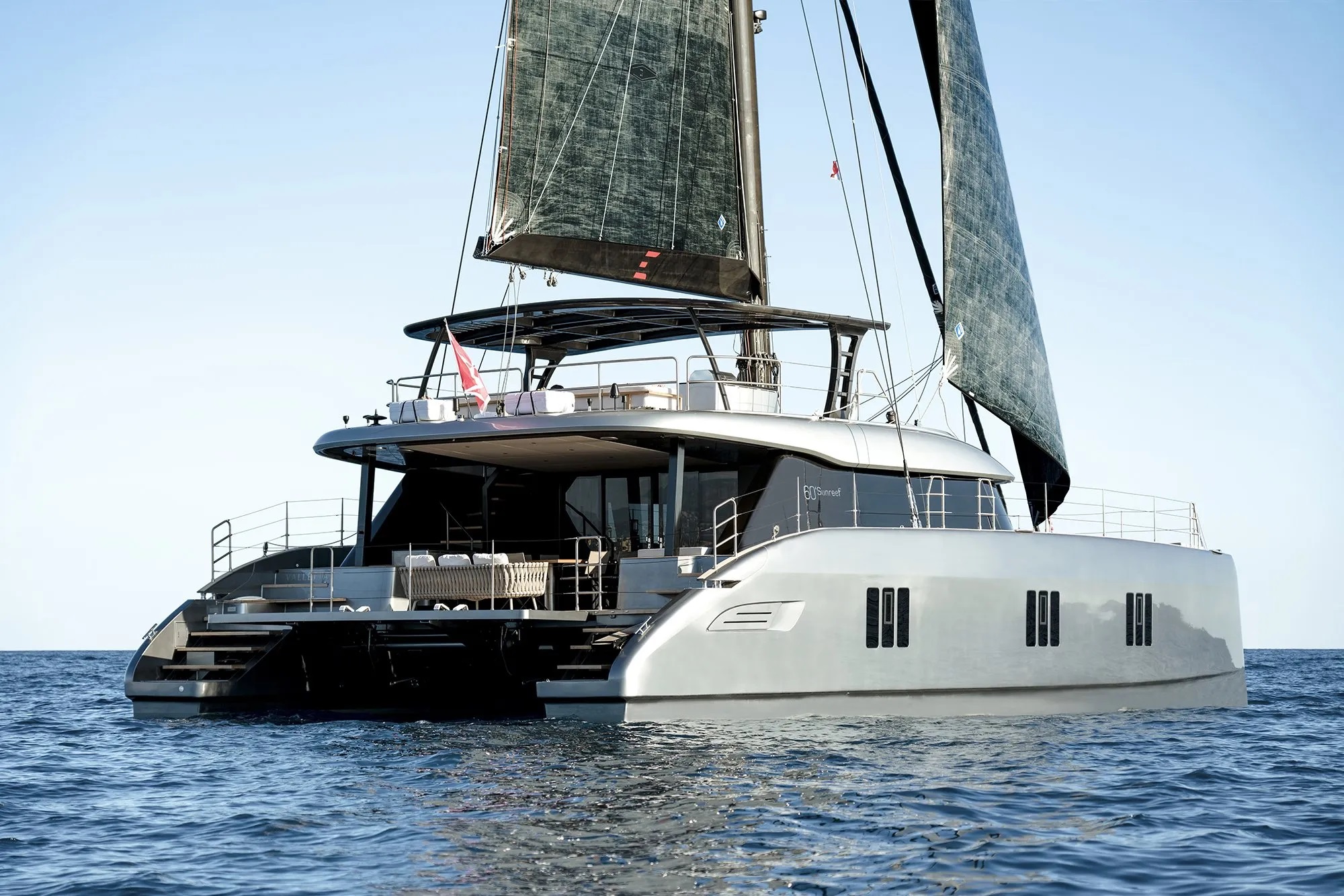 The main deck aft presents another sociable terrace with a dining setting and lounge seating plus steps to the water’s edge and the hydraulic swim platform.