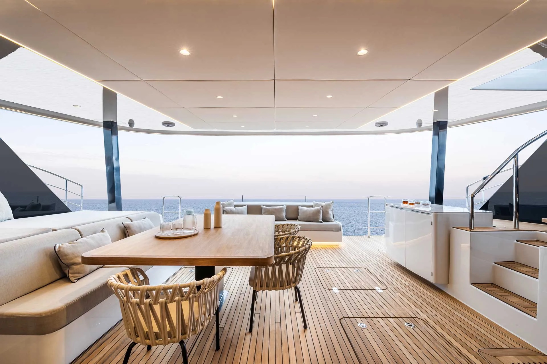 The main deck aft presents another sociable terrace with a dining setting and lounge seating plus steps to the water’s edge and the hydraulic swim platform.