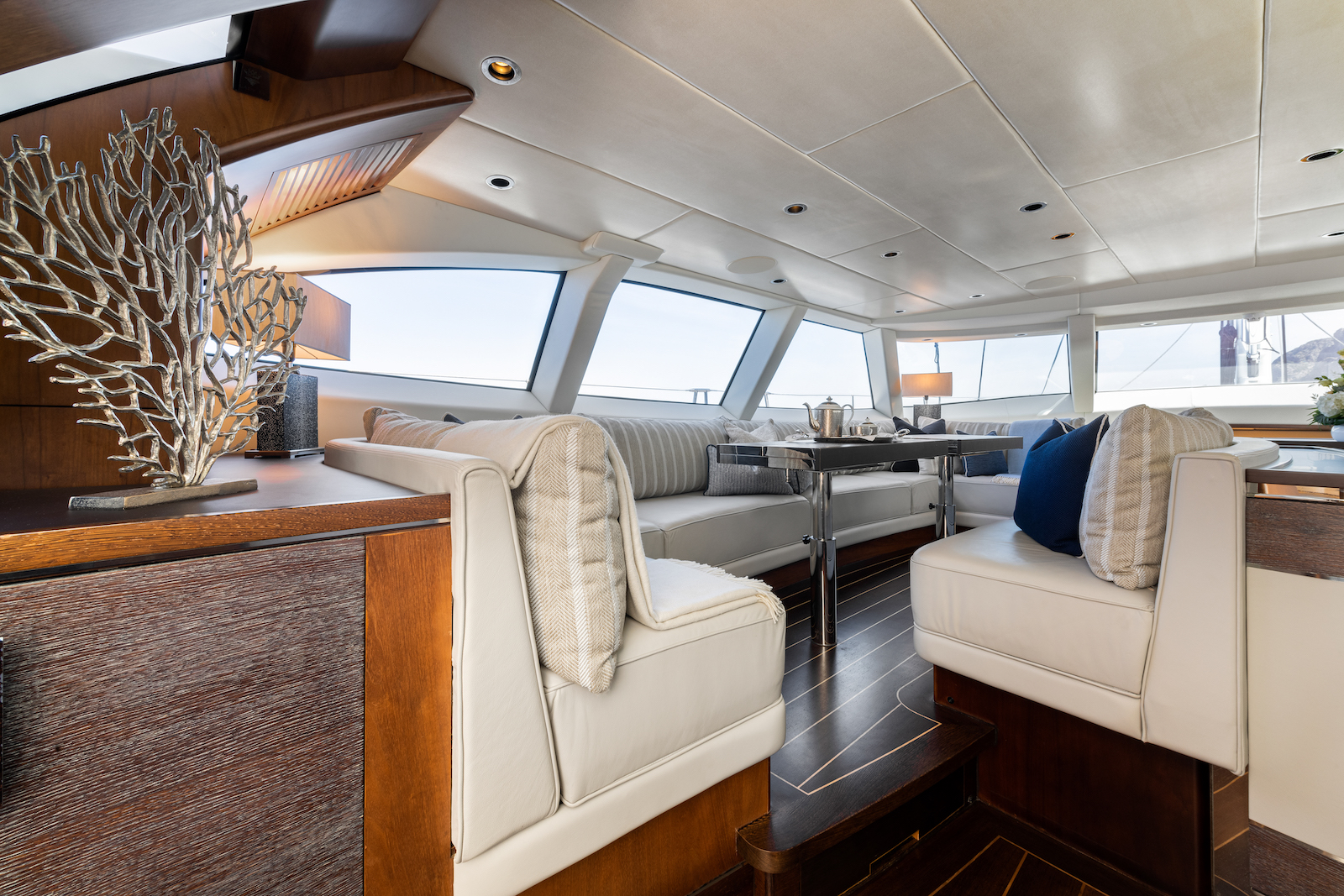 The yacht benefits from a split-level salon with a bar and built-in dining setting on the upper level and a generous and luxurious lower-level lounge.