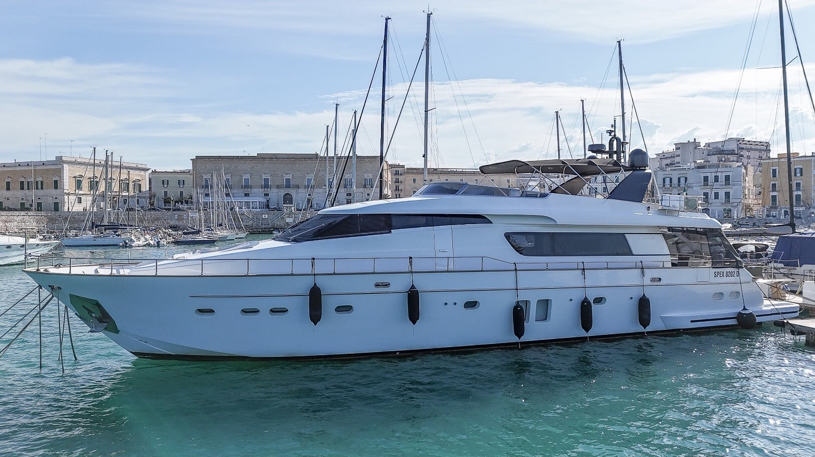 Motor yacht SANLORENZO 82 is a 25.60 m (84') flybridge yacht built in 2007 and refitted in 2022. The flybridge benefits from a soft bimini giving the ultimate in flexibility and the interior is simple and spacious.
