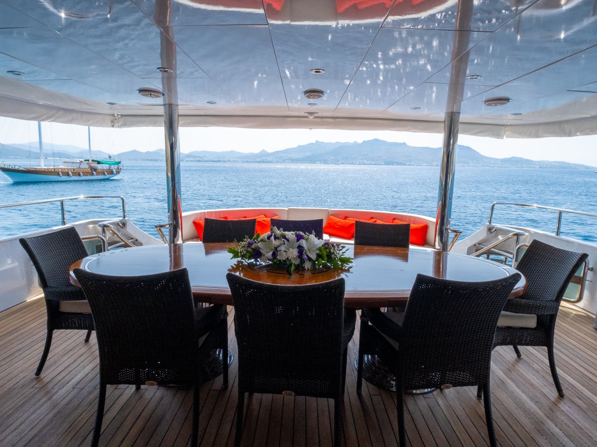 The bridge deck is dedicated to al fresco dining and offers guests a large moveable dining table and chairs offering flexibility to shelter under the sun deck overhang or take advantage of the full sun aft. The aft space is used for tender and jet ski storage while underway, and for sunbathing at anchor when the toys are launched.