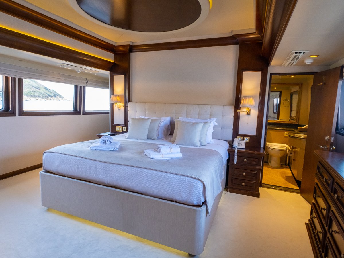 Across the three exterior deck levels she offers guests plenty of space to unwind and soak up the sun while the interior is spacious and elegant with a choice of salons and accommodation for up to ten guests in five suites. There are six crew on board throughout the charter.