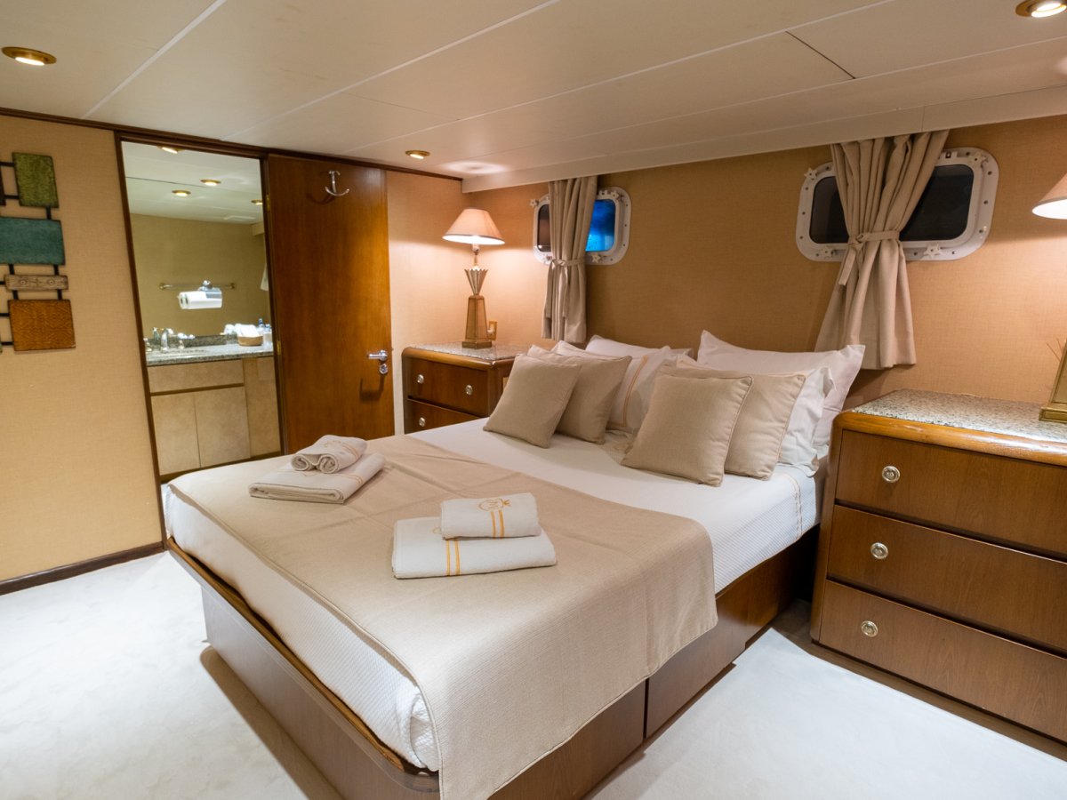Across the three exterior deck levels she offers guests plenty of space to unwind and soak up the sun while the interior is spacious and elegant with a choice of salons and accommodation for up to ten guests in five suites. There are six crew on board throughout the charter.