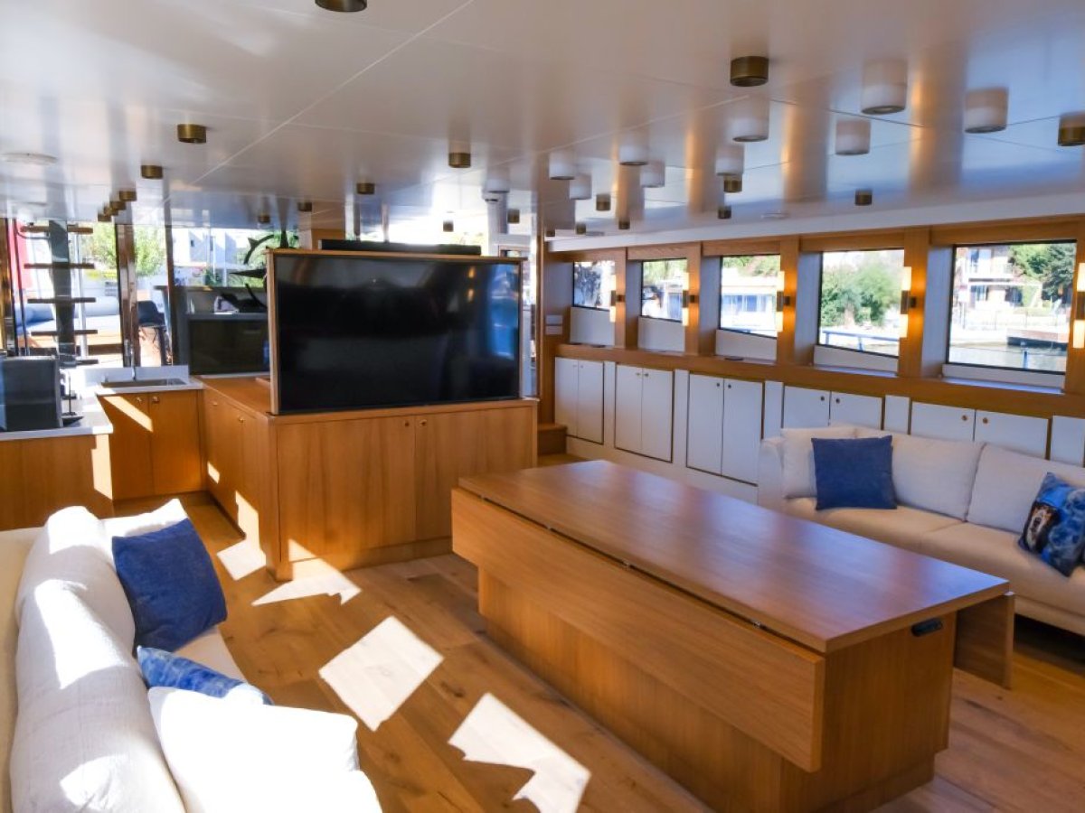 The custom-built motor sailer offers a choice of al fresco seating on deck and benefits from the additional of a flybridge.