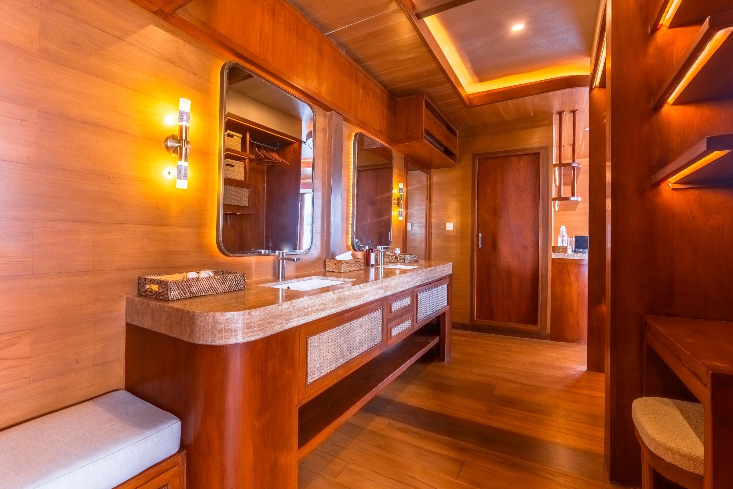 The master suite is full beam with a deluxe ensuite bathroom and a seating area plus a private terrace with a jacuzzi. The two upper deck VIP suites are finished in stunning wood panelling, have beautiful ensuite bathrooms, seating and a private balcony.
