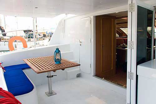 Stepping outside from the saloon brings you into the cockpit that boasts Sunbrella seat cushions and a large teak cockpit table. You can even choose to sleep outside if you wish as the cockpit table converts to a queen size bed!!.