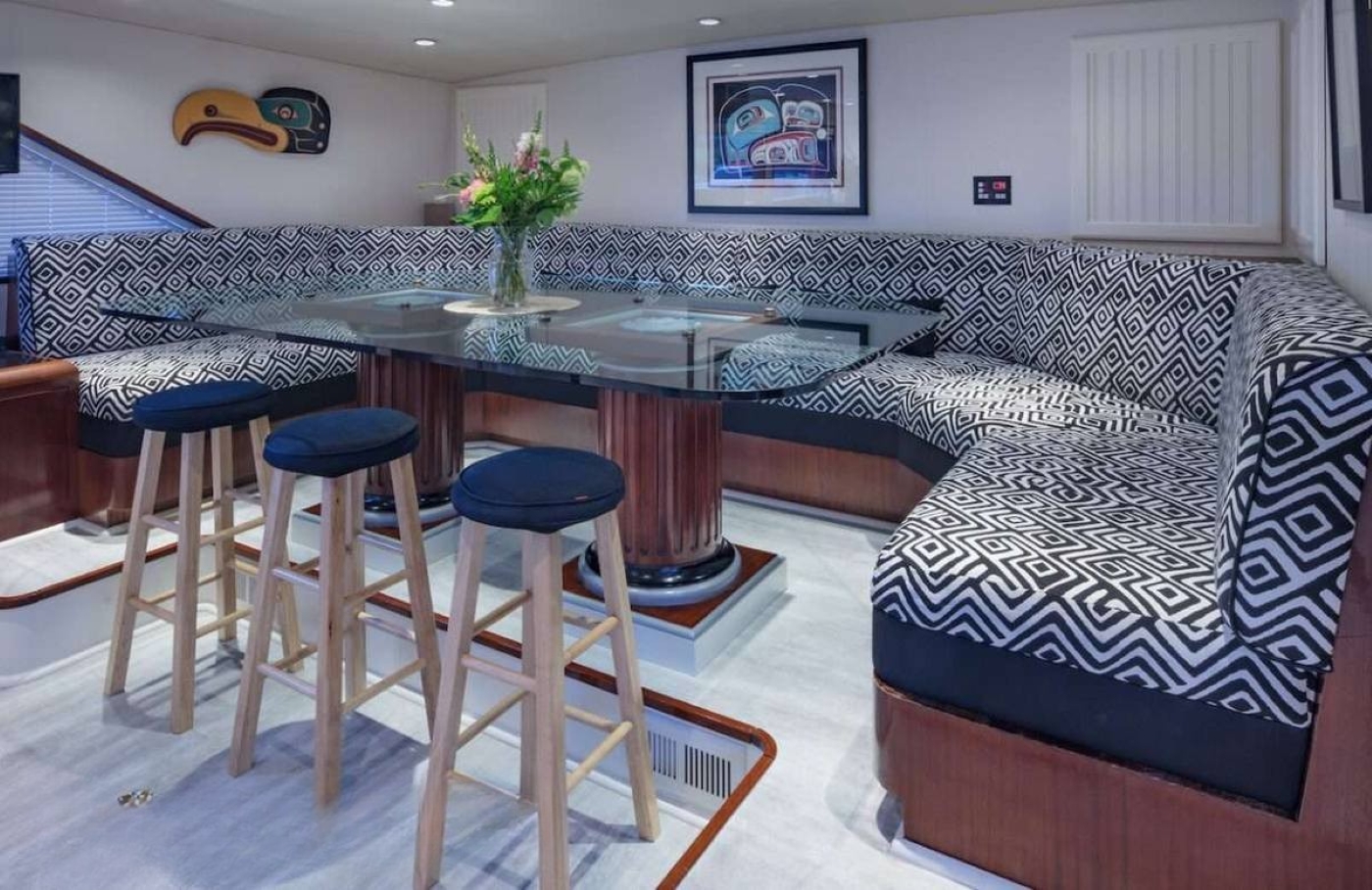 The enclosed aft deck offers a cozy dining area, allowing guests to savor meals while surrounded by Alaska’s breathtaking landscapes, regardless of the weather.