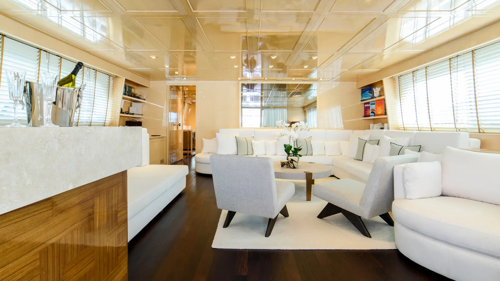 The main salon is filled with light from the windows which run the whole length of the space. A combination of sofas and armchairs create a convivial arrangement perfect for any group of guests.