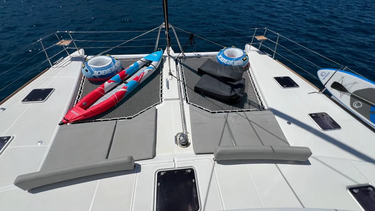 Wide gangways lead around to the foredeck where a cosy terrace and netted trampolines are perfect for lazy days in the sunshine.