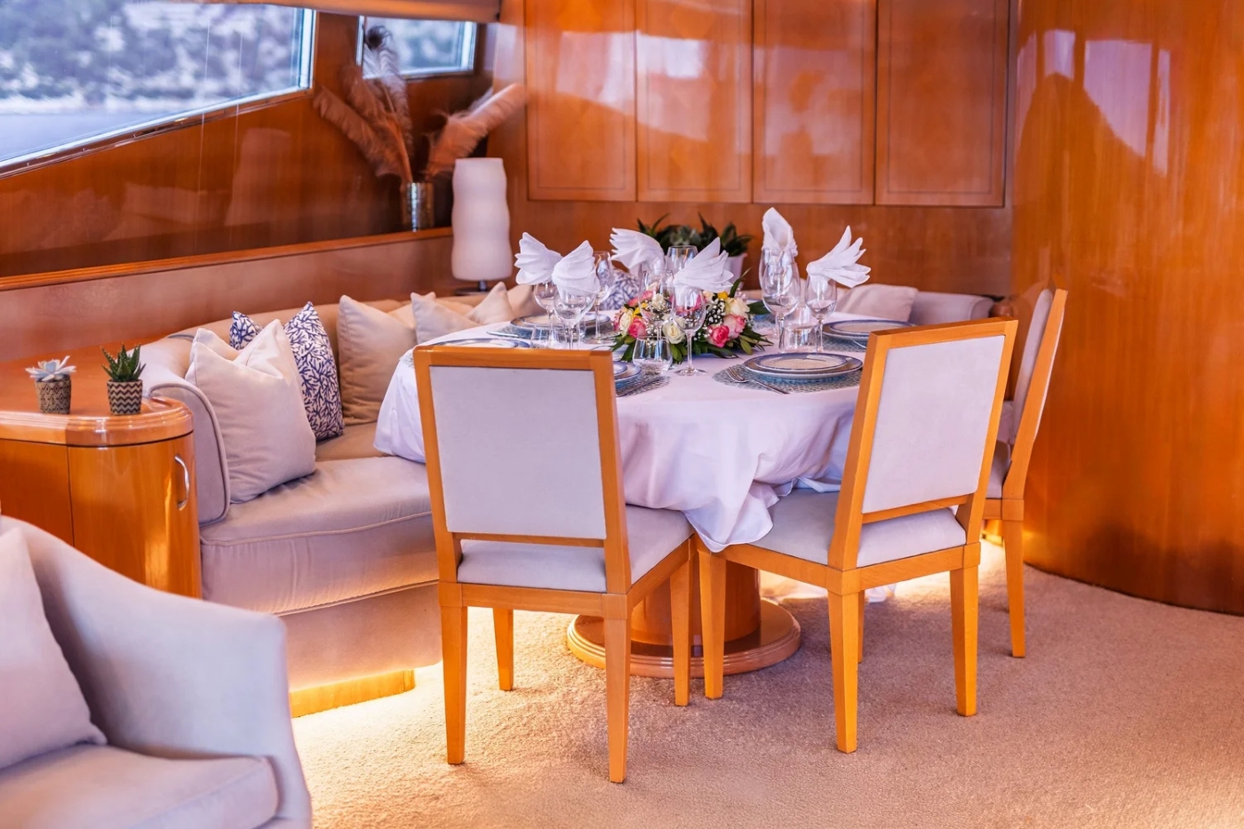 The main deck aft is perfect for more sedate entertainment with an al fresco dining setting including two curved bench seats and a round table, sheltered under the flybridge overhang.