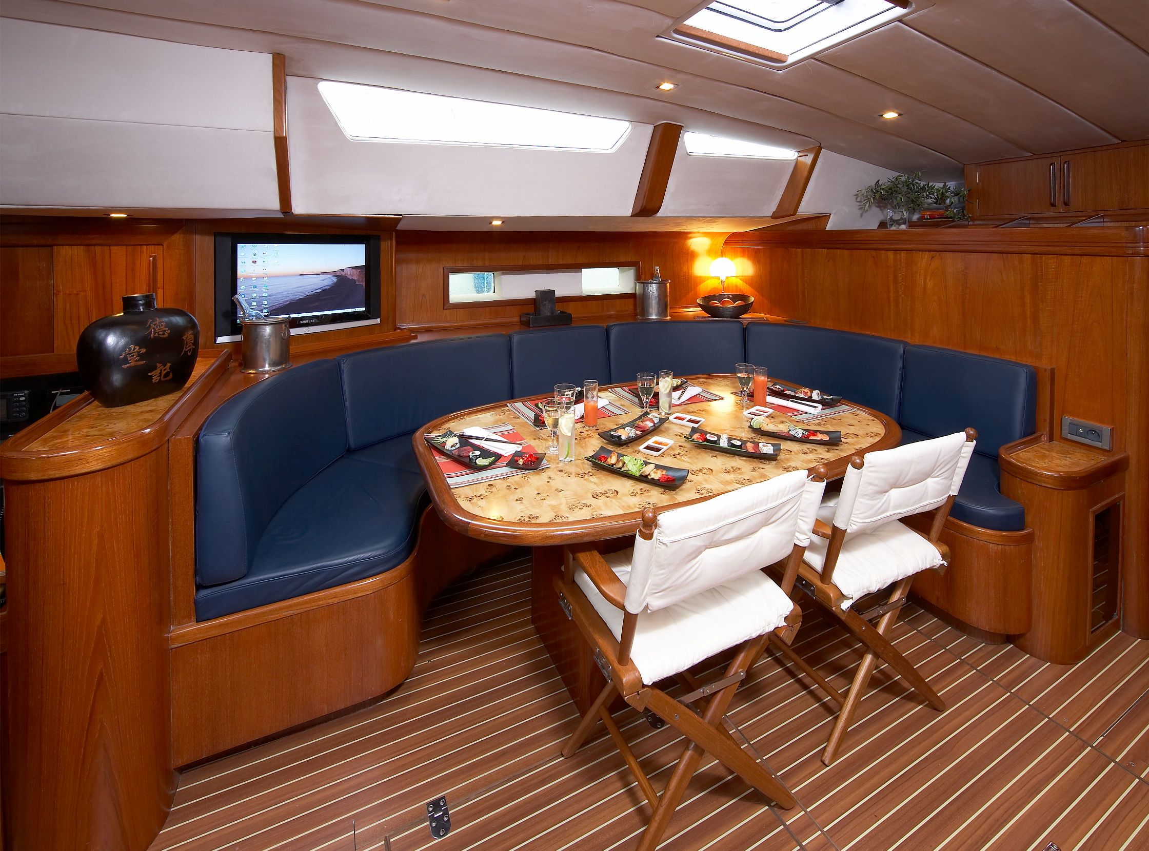 Noheea’s Saloon is unusually large and on the port side there is an oval dining table surrounded by comfortable leather seating, with extra seats available if required. On the starboard side more seating can be found as well a bar area with fridge and ice machine.