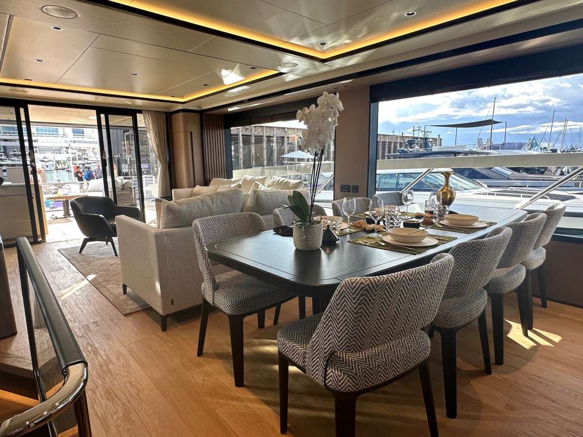 Sliding doors lead onto the main deck aft with panoramic windows filling the salon with natural light. Behind the dining table is the semi-open galley and the wheelhouse is forward.
