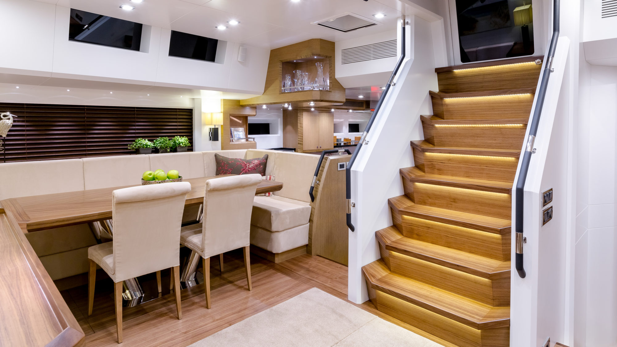 The light and elegant interior provides guests with a sociable main salon with a generous dining setting and separate lounge space. The dining area has a built-in u-shaped sofa and chairs surrounding the table while the lounge is a cosy space with built-in seating and a coffee table.