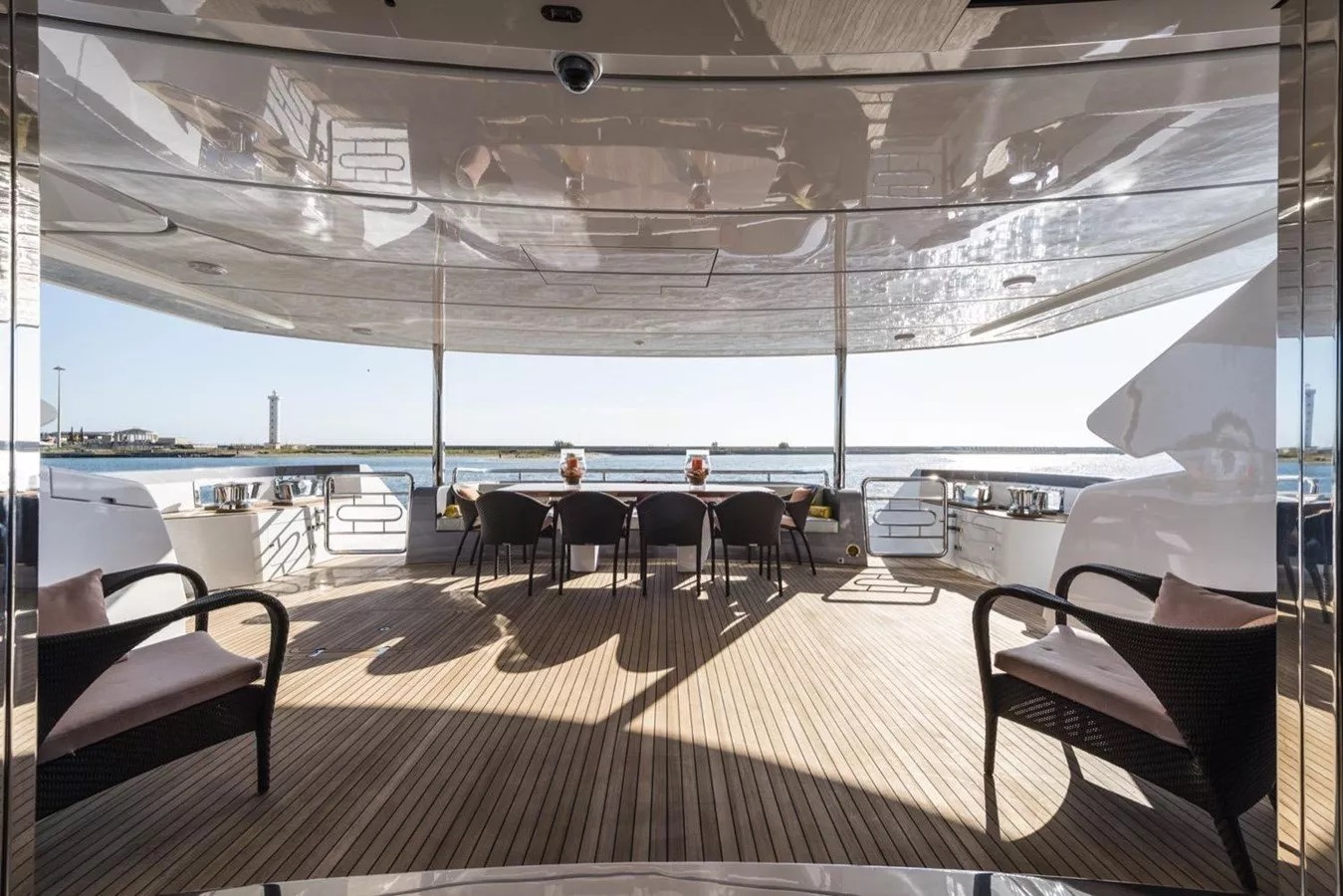 Her flybridge design ensures spacious exteriors decks for guests to make the most of the surroundings and enjoy the al fresco lifestyle, plus she boasts and sun deck jacuzzi. Her chic interior is unique and makes reference to ...