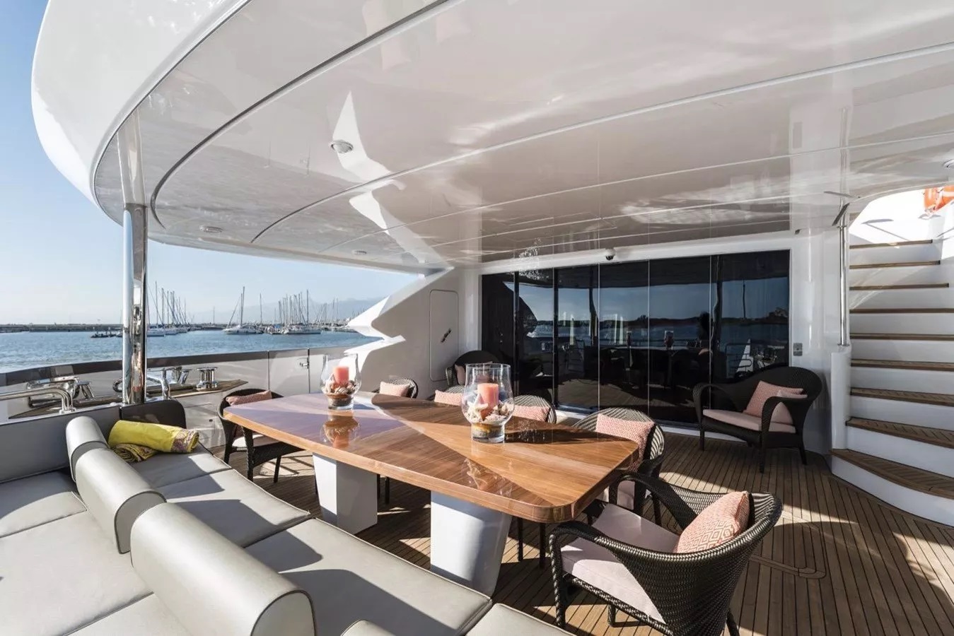 Her flybridge design ensures spacious exteriors decks for guests to make the most of the surroundings and enjoy the al fresco lifestyle, plus she boasts and sun deck jacuzzi. Her chic interior is unique and makes reference to ...