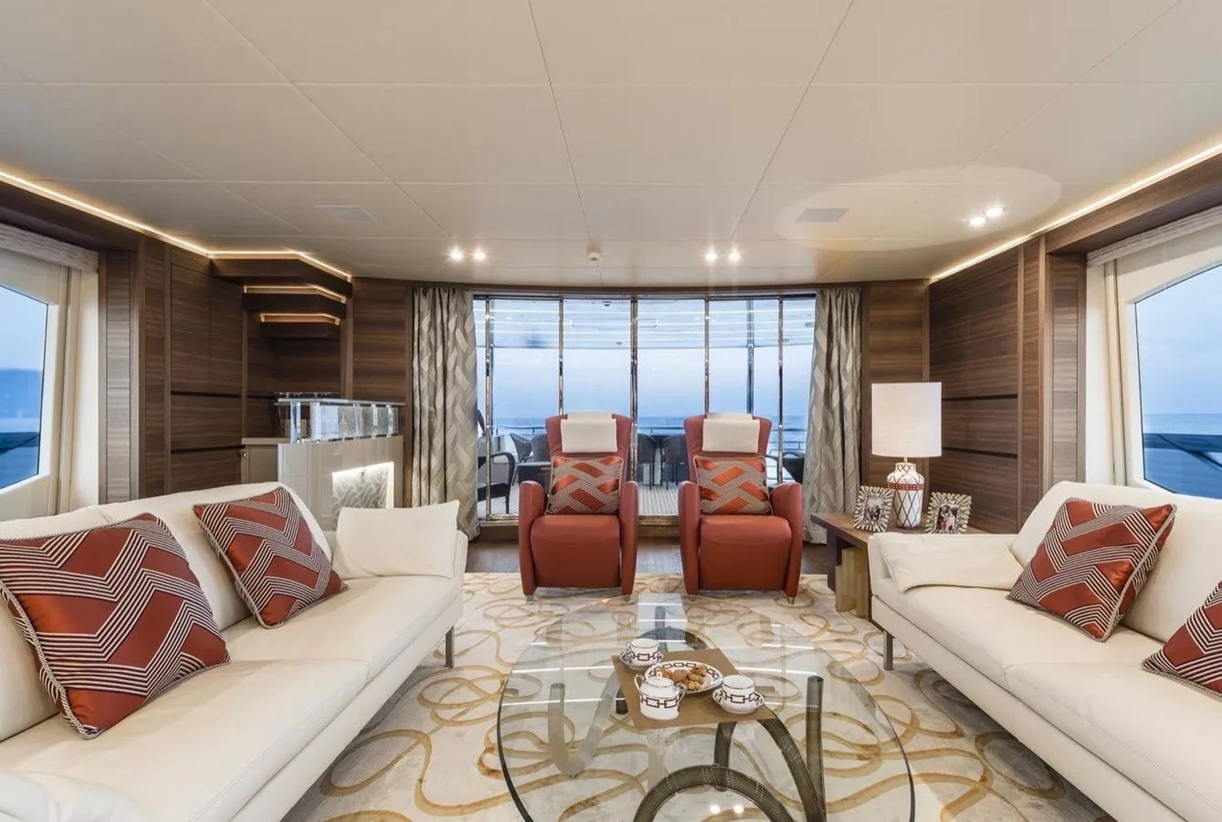 The main salon is a sociable space that includes an aft lounge and forward dining room. The lounge has a mid-century modern feel and is arranged with two sofas and additional occasional chairs.