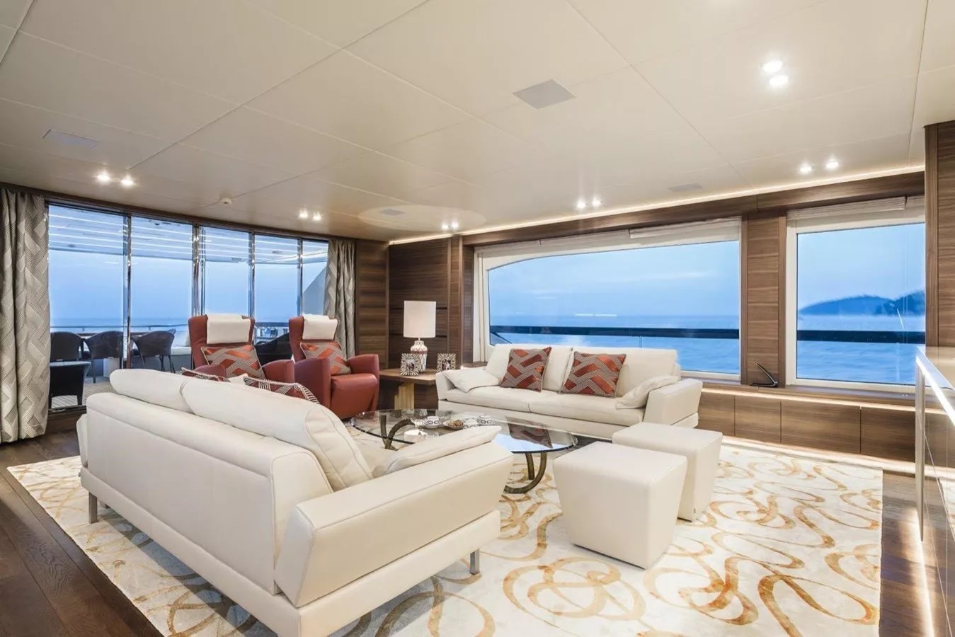 The main salon is a sociable space that includes an aft lounge and forward dining room. The lounge has a mid-century modern feel and is arranged with two sofas and additional occasional chairs.
