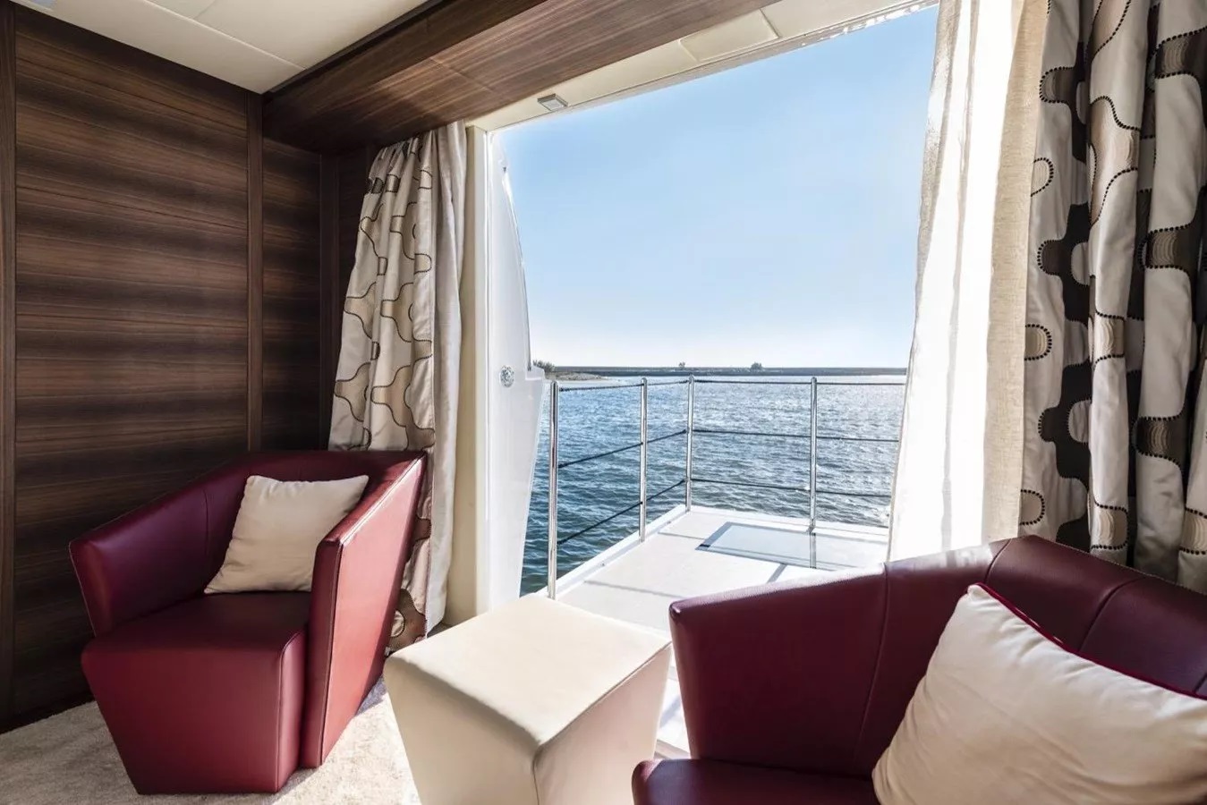 Amidships on the main deck is the well-equipped galley and convenient day head while the master suite is forward. The master suite is forward on the main deck and boasts a king-sized bed, seating area, fold-out balcony and deluxe ensuite bathroom.