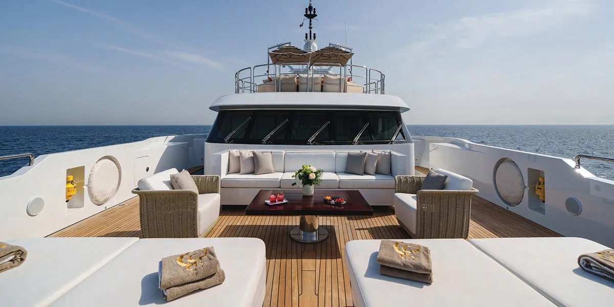 The foredeck is a wonderful open deck area perfect for sunbathing. Here there is a lounge setting, two double sun pads and a mosaic jacuzzi overlooking the bow.