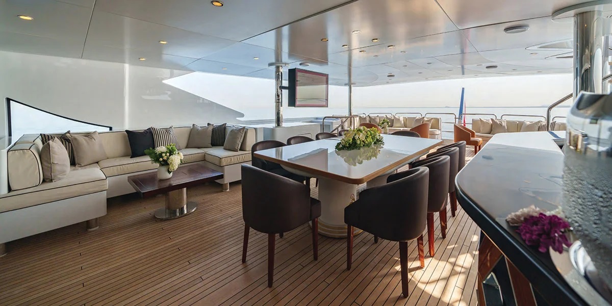 She boasts a wealth of luxurious amenities and an impressive choice of entertainment and relaxation spaces both inside and outside including a deck jacuzzi, beach club and array of water toys. She can accommodate up to ten guests in five suites with a crew of eleven on board.
