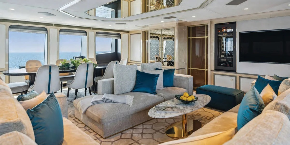 The main deck aft offers a sumptuous lounge with a fitted u-shaped sofa and comfortable oversized armchairs, ideal for curling up in with a drink or a good book.