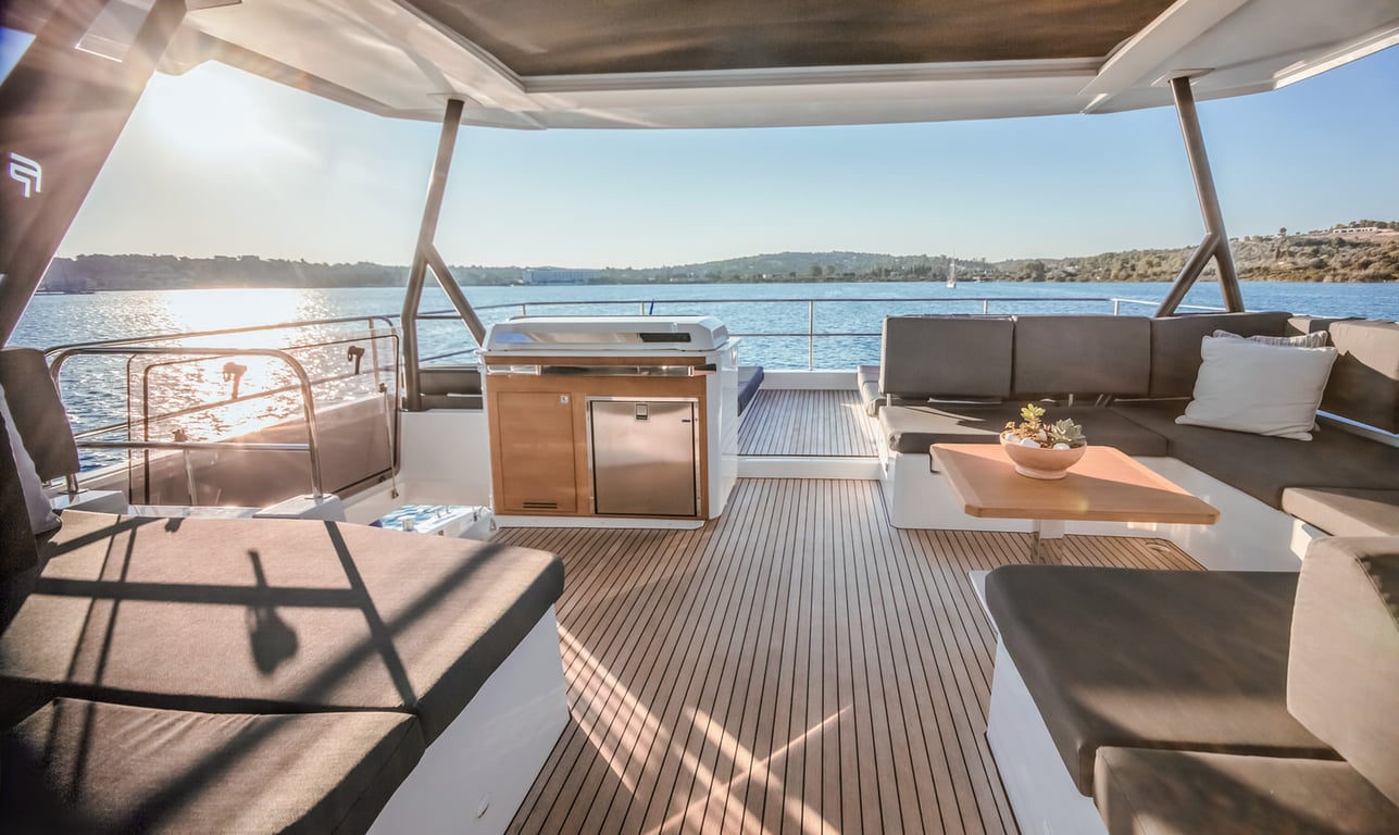 The sociable main deck aft is configured with a corner dining setting with bench seating, an additional aft sofa and elevated sun pads.