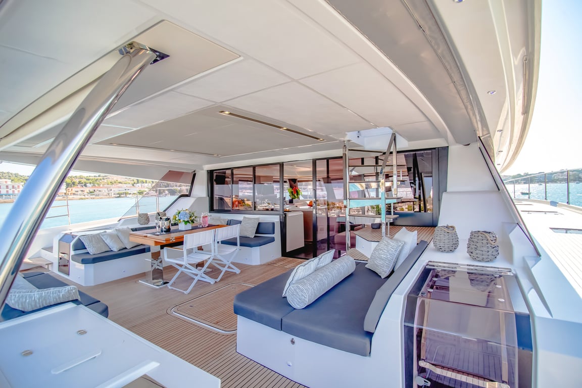 Performance, style and luxurious amenities characterise this motor catamaran and she includes a deck jacuzzi, spacious sun deck and a light filled interior. Four crew members are on board throughout the charter.