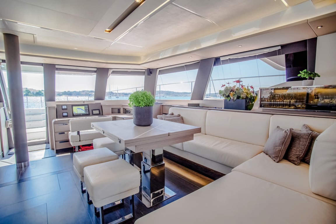 The sociable main deck aft is configured with a corner dining setting with bench seating, an additional aft sofa and elevated sun pads.