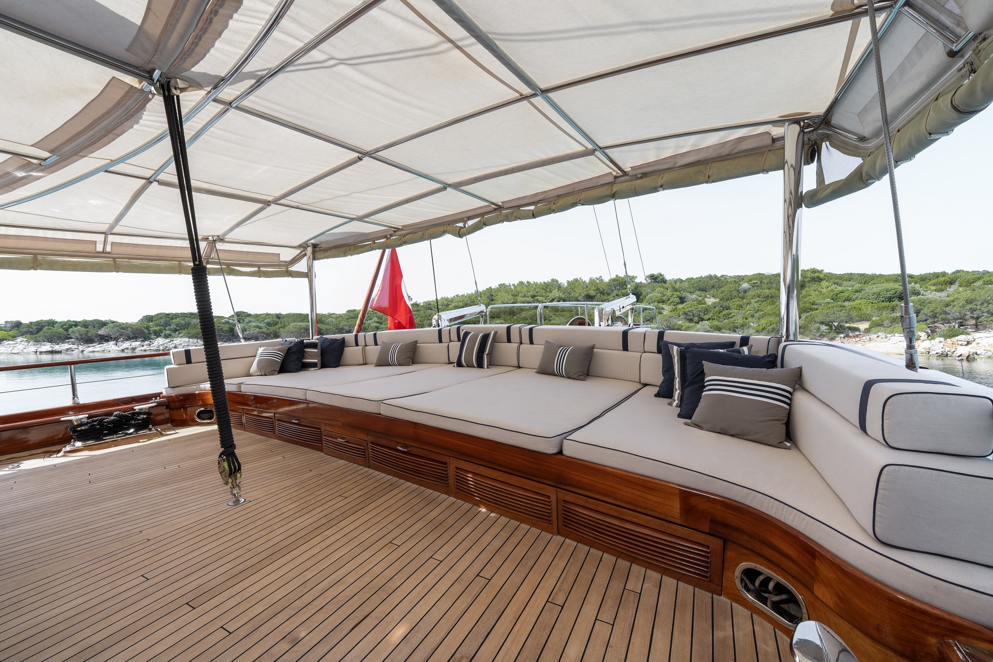 The aft deck is sheltered under a soft bimini roof creating a shaded space where guests can escape from the sun.