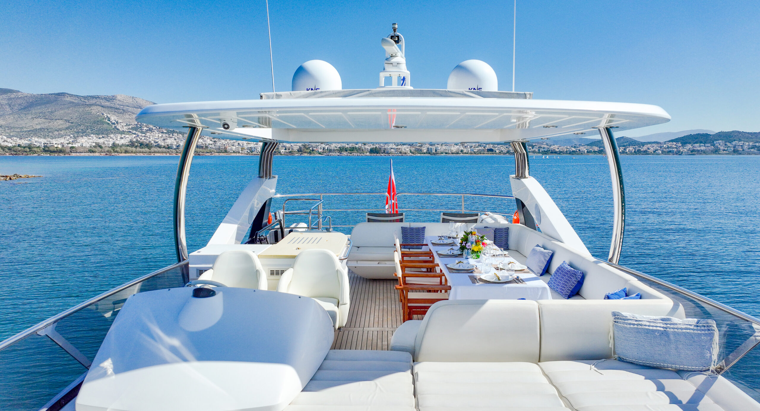 Arriving by tender at the swim platform, guests will be welcomed onto the aft deck where there is a dining area with sofa seating surrounding a wooden table.