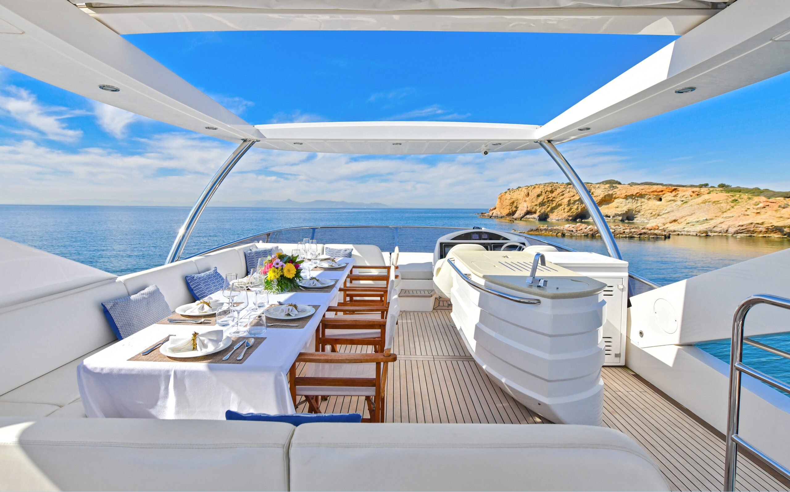 Arriving by tender at the swim platform, guests will be welcomed onto the aft deck where there is a dining area with sofa seating surrounding a wooden table.
