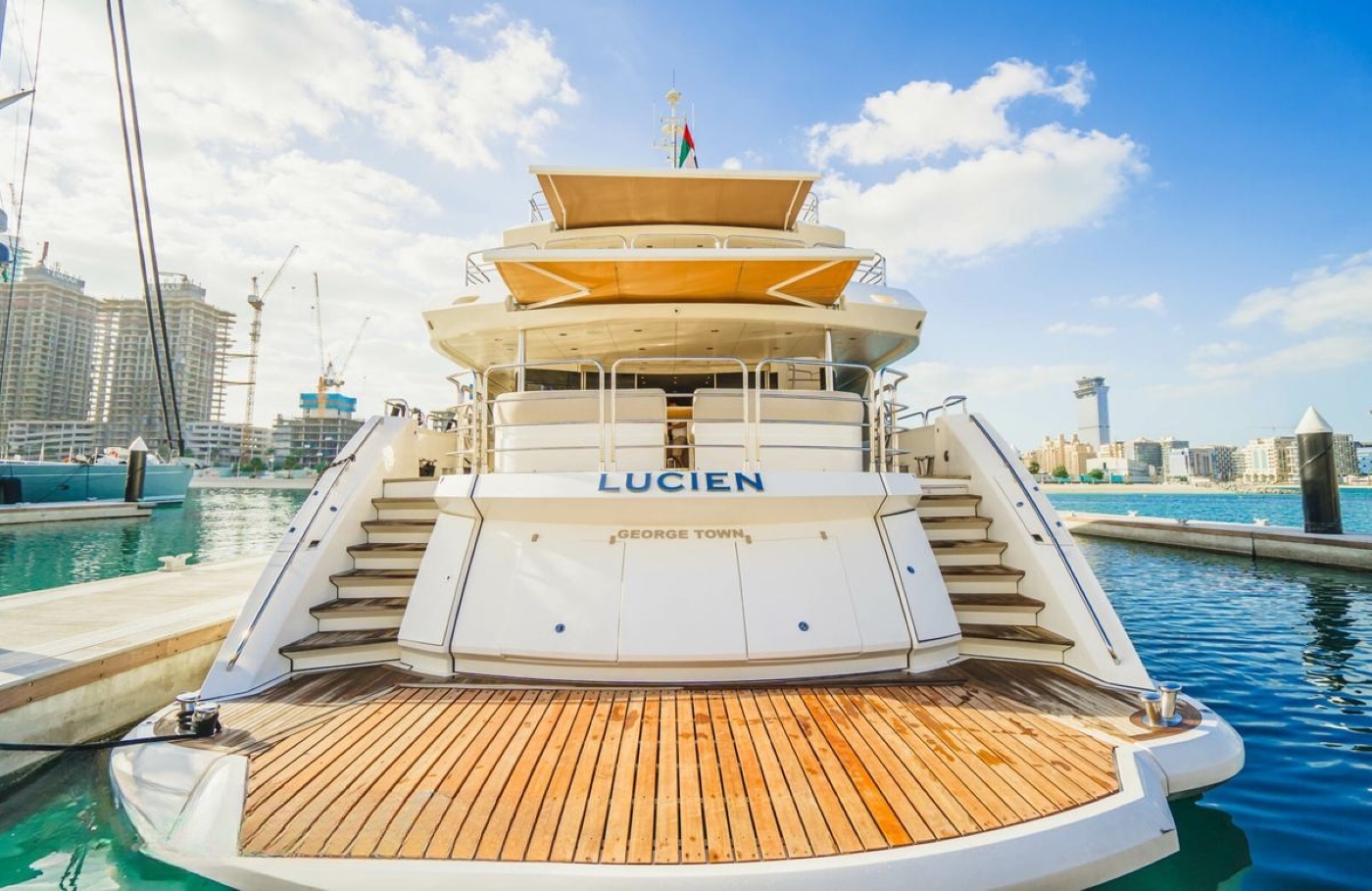 LUCIEN features sleek lines, expansive deck spaces, and stunning interiors designed for unforgettable charter experiences. Throughout this premium vessel, Ralph Lauren interior and exterior upholstery adds a refined touch, blending nautical charm with contemporary luxury.