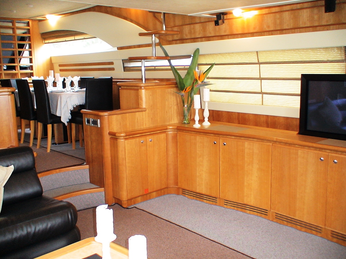 Audio Visual Equipment onboard includes a large flat screen TV/DVD and stereo system in the salon with surround sound and speakers on the aft deck and fly bridge. Each cabin is also equipped with a TV/DVD entertainment