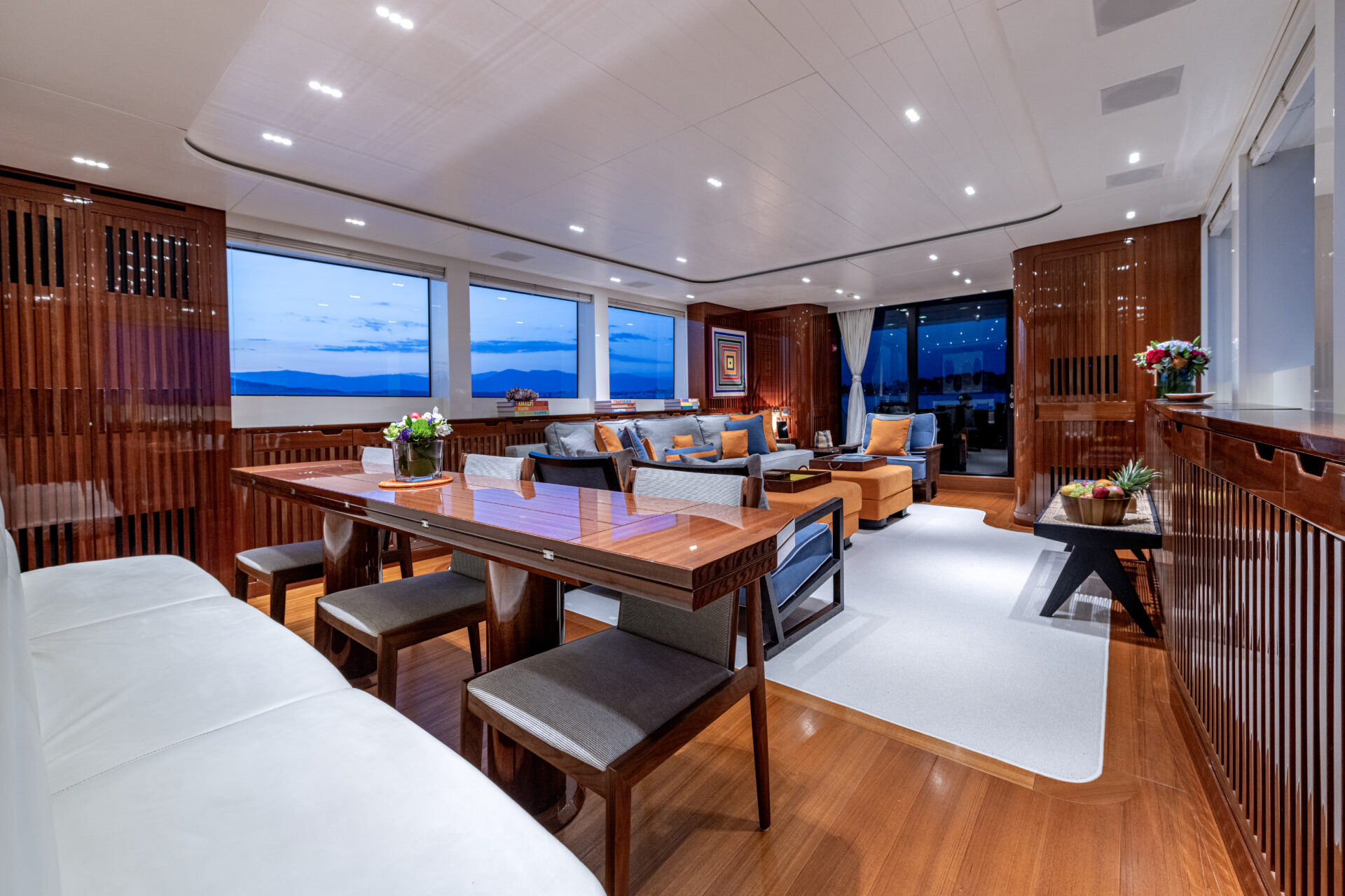 The main saloon provides a welcoming social hub with comfortable seating arrangements and state-of-the-art entertainment systems. Each space flows seamlessly, creating an atmosphere of understated luxury and contemporary comfort that reflects the finest Italian design traditions.
