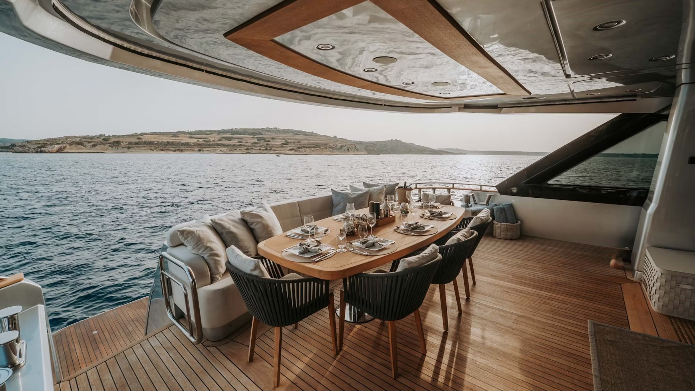The main deck aft platform provides easy access to the water and serves as the primary entertainment area. The flybridge offers elevated views and additional relaxation space with integrated seating areas.