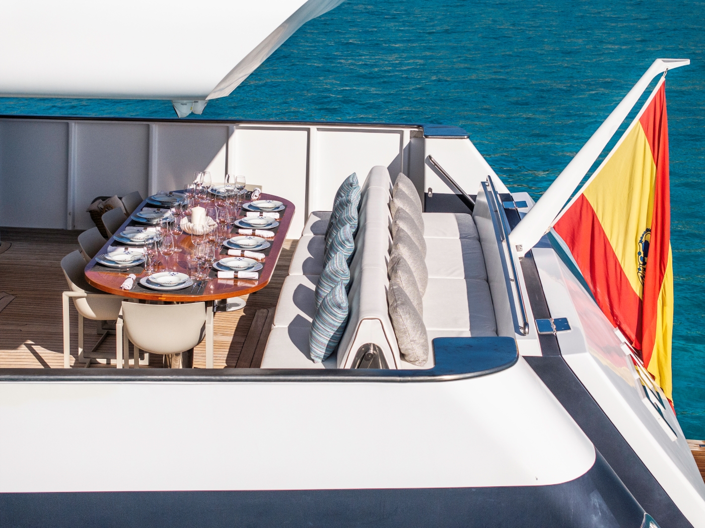 The aft platform provides seamless access to the water and beach club area, while the deck Jacuzzi offers panoramic views during sunset cruises. Multiple outdoor lounging areas across various deck levels ensure guests can find ...