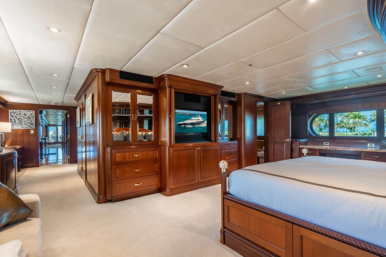 The full-beam master stateroom is located on the main deck and features a king-size bed and en-suite bath. Below deck are two queen staterooms, a twin stateroom, and a convertible room that can function either as a guest cabin or a gym, depending on your clients' needs.